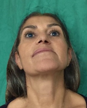 מטופלת בת 45 שהתלוננה על מראה לא אסתטי של הסנטר בגלל סטיה שלו לצד שמאל והמראה הכללי שלו. עברה ניתוח גניופלסטי (עיצוב מחדש של הסנטר) לצורך מירכוז הסנטר לקו האמצע ושינוי צורתו הכללית.